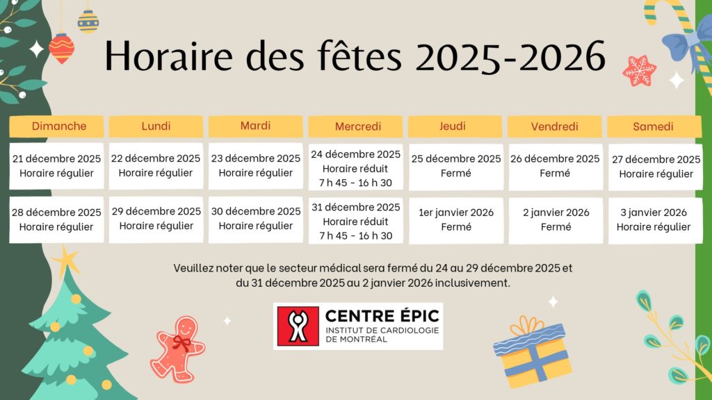 À l’approche du temps des Fêtes, toute l’équipe de la recherche du Centre ÉPIC de l’Institut de cardiologie de Montréal tient à vous souhaiter de joyeuses Fêtes, remplies de santé, de repos et de moments précieux avec vos proches.