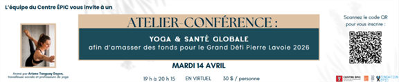Offert en soirée pour favoriser la détente et un sommeil réparateur, cet atelier est une belle occasion de découvrir les bienfaits du yoga tout en contribuant à la levée de fonds du Grand défi Pierre Lavoie 2026.