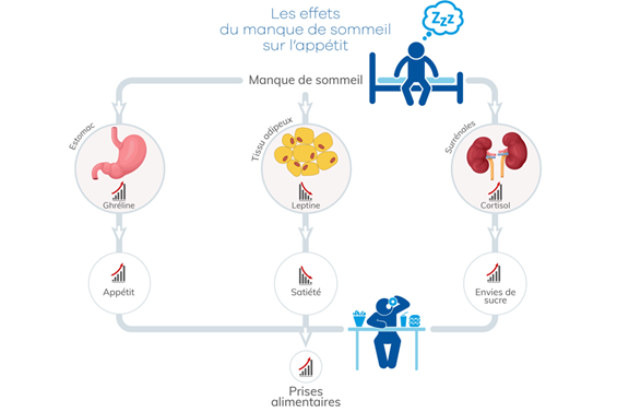 Cela s’explique par différents mécanismes qui se mettent en place lorsque le sommeil est insuffisant ou de mauvaise qualité. Tout d’abord, on observe une dérégulation hormonale marquée par une augmentation de la sécrétion de cortisol et un déséquilibre apparaît entre les hormones de la faim et de la satiété. Cette situation entraîne une augmentation de l’appétit, en particulier pour les aliments riches en glucides et en calories, favorisant ainsi un apport énergétique plus élevé et, à terme, une prise de poids6.